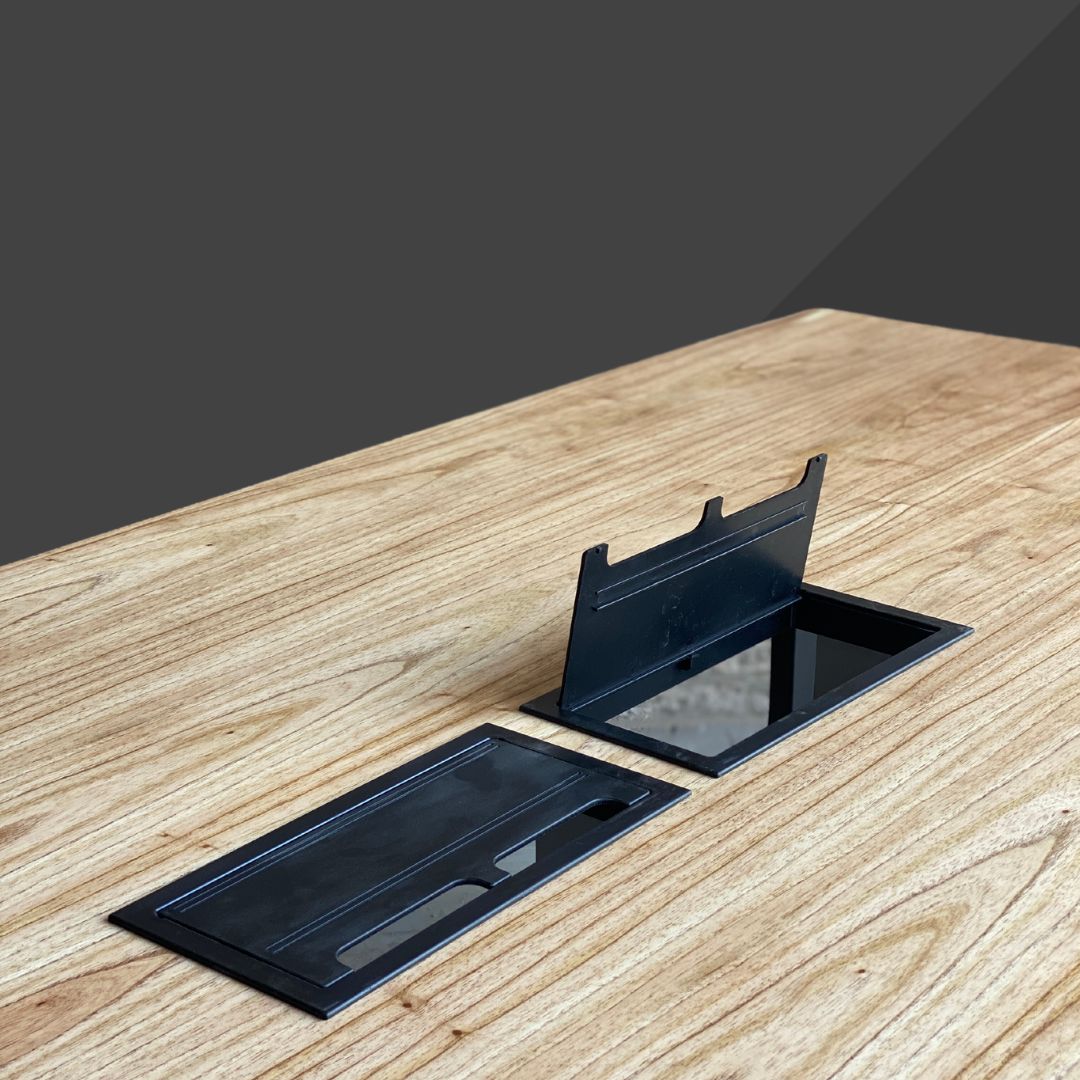 Este anexo se puede complementar en cualquier escritorio o mesa Rodak. El box de conexión posee una tapa muy delicada, la cual posee ranuras para que pasen los cables aun estando cerrada, dentro del mismo se encuentran 2 cajas con un total de 4 tomas (2 por cada caja).